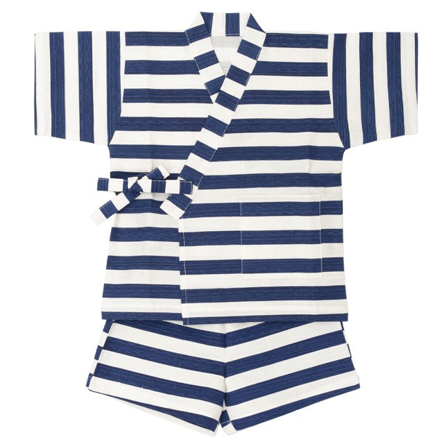 sandiaの子供甚平に、新柄のインディゴつばめが仲間入り。 線画ペンギン、ネイビー太ボーダー、インディゴつばめ 3種類からお選びください。(線画ペンギンは別ページになります)通気性がよく着心地のいい綿100%の甚平。模様織物で生地に凹凸があるので肌にまとわりつかず、汗をかいてもサラッと快適。パリッと張りのある生地厚で形が綺麗。 ペラペラの甚平はちょっと...と言う方に是非オススメします。 お祭りだけじゃなく、普段着にも◎。かっこいい太ボーダープリントはビーサンやサンダルと相性抜群。洋服感覚で着られる肩上げなしのパターン。上着は内紐と外紐の2か所で着付け終了。パンツはウエストゴムで簡単にお着替えできます。ポケット付き。サイズ:90/105/120/135 <hr color="#f5f5f5" size="1"> 実寸(約cm)<br><br> ◆上着<br> 着丈[39.0/43.0/47.0/51.0]<br> 身巾[30.0/33.0/39.0/42.0]<br> ◆パンツ<br> 丈[27.0/33.0/38.0/43.0]<br> ウエスト巾[23.0/24.0/25.0/26.0]<br> 股下[9.0/12.0/15.0/18.0]<br>・素材: 綿100%<br> ・ブランド: sandia(サンディア)<br> ・生産国: 中国製