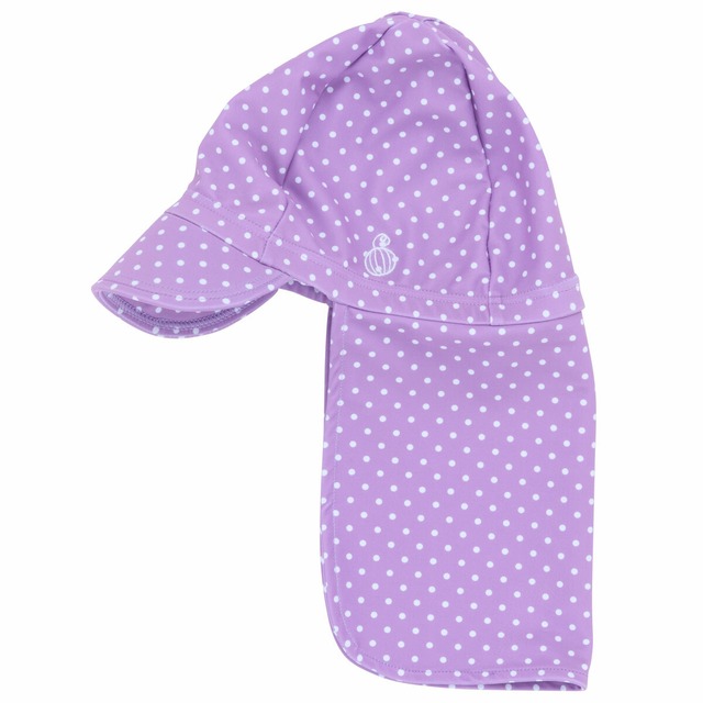 水着素材のスイムキャップに日除けが付いて屋外プールも安心。形にもこだわって、スタイリッシュな4枚ハギパターンにしました。ベーシックで飽きのこないミニドット柄です。色味は落ち着いた印象のネイビーとパープルをご用意しました。UPF50+のUV性能で98%以上紫外線をカットします。サイズはフリーですが、平置き頭囲を48cmにしてあり、またよく伸びますので54cmくらいまで着用できます。ベビーには緩めの着用感で喜ばれます。 サイズ:[フリー 48-54cm] ・ソフトフィット設計 ・塩素ガード ・紫外線遮蔽率98%以上のUVカット ・ホルマリン他各種検査合格品(BOKEN) ・素材: 本体:ポリエステル82%, ポリウレタン18%(2WAYトリコット編み) ・UV性能: UPF50+ ・企画: 日本 ・生産: 中国