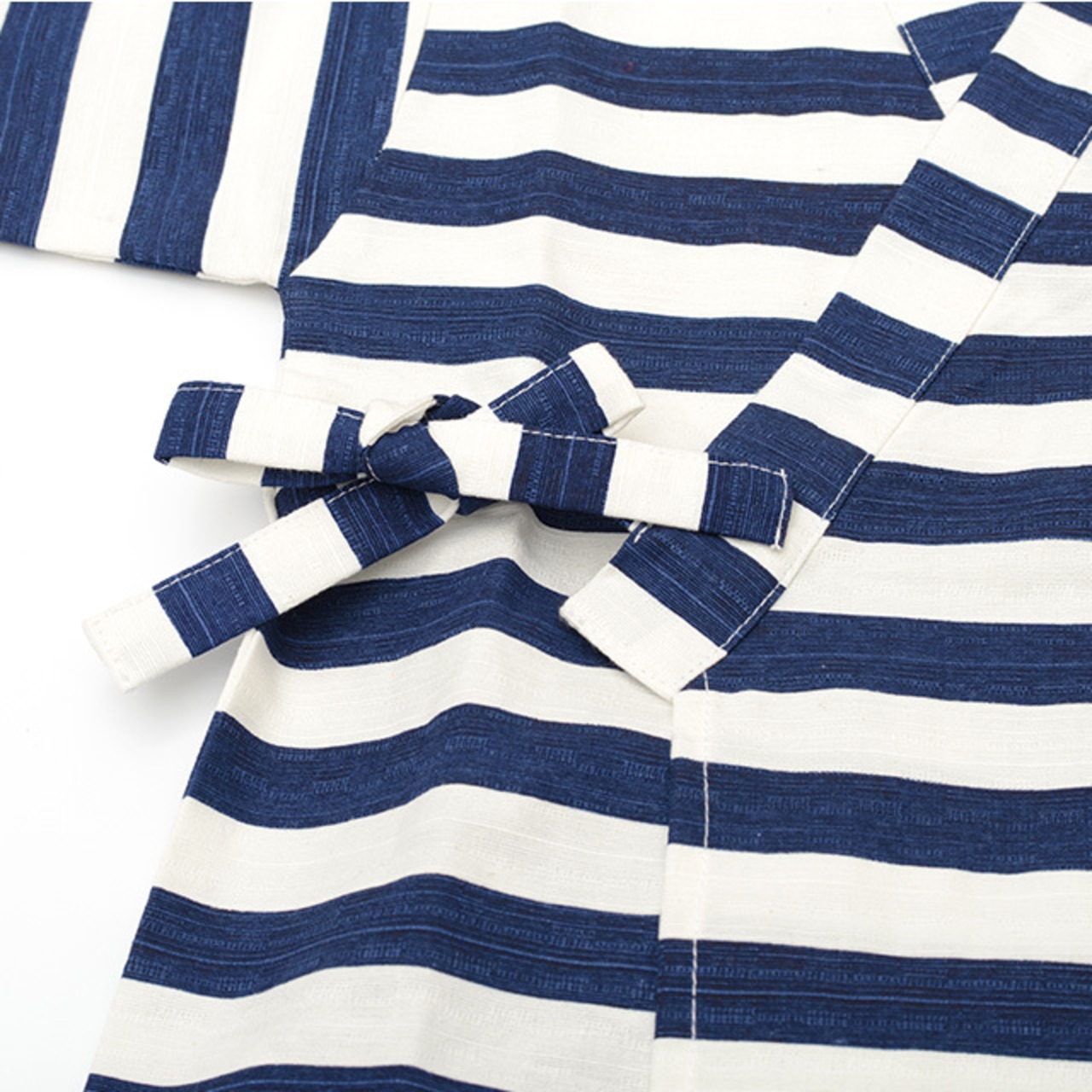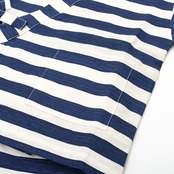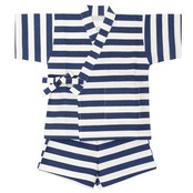 通気性がよく着心地のいい綿100%の甚平。模様織物で生地に凹凸があるので肌にまとわりつかず、汗をかいてもサラッと快適。ありそうでなかったかっこいい太ボーダープリントでビーサンやサンダルと相性抜群。洋服感覚で着られる肩上げなしのパターン。上着は内紐と外紐の2か所で着付け終了。パンツはウエストゴムで簡単にお着替えできます。ポケット付き。歴史のある甚平専門工場で生産していますので、生地、縫製、プリントどれをとっても安心できる品質です。