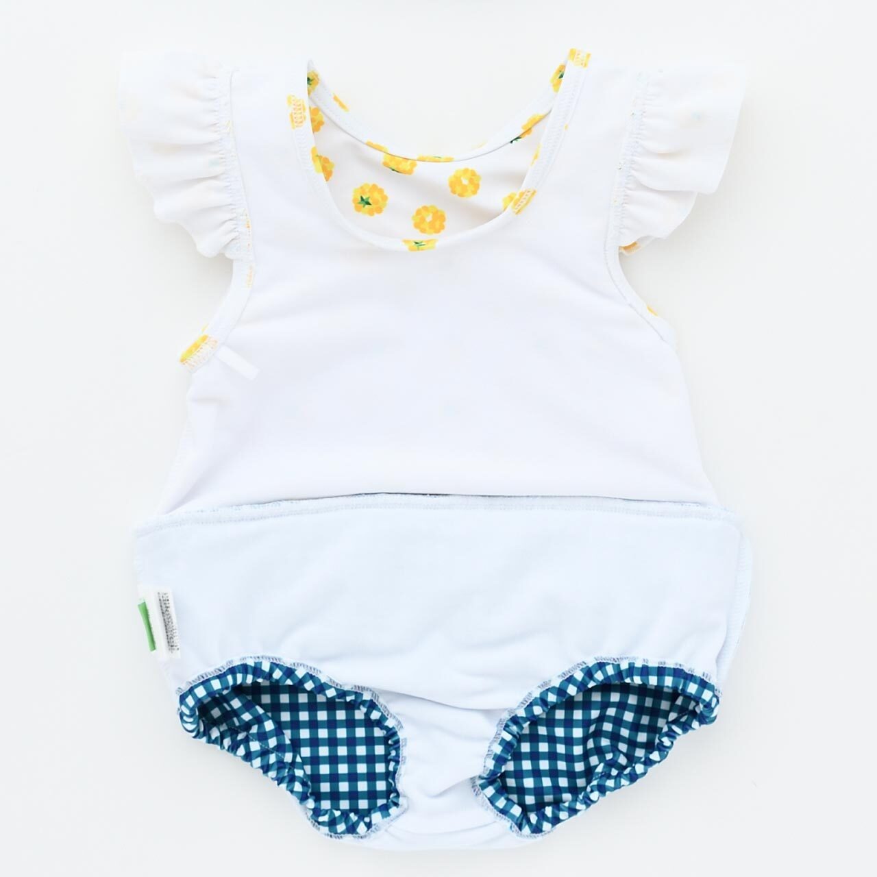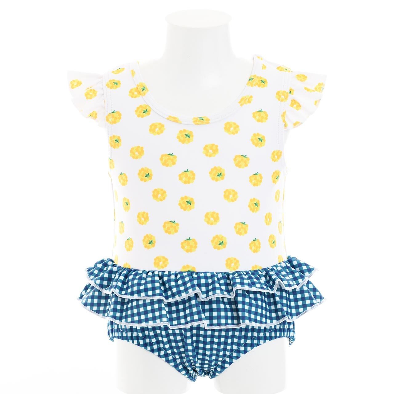 甘くておいしそうなイエローラズベリー総柄にシックなギンガムチェックを合わせたデザイン。お揃いキャップ付きのベビーUV水着、肌触りの良い裏地。お尻周りにゆとりをもたせたデザインでプール用おむつをはいてもOK。ソフトな肌触り、柔らかストレッチで快適な着心地。洗っても色落ちしにくい高耐久素材を使用しています。ベビースイミング、プールに。